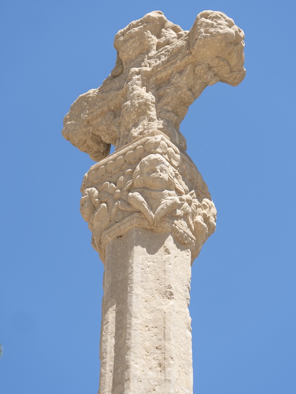 Sobre él se alza un capitel con decoración geométrica en relieve y la cruz, de brazos flordelisados tallados en relieve. Esta presenta en uno de sus frentes una imagen de Cristo crucificado y, en el opuesto, una Virgen con ángeles.